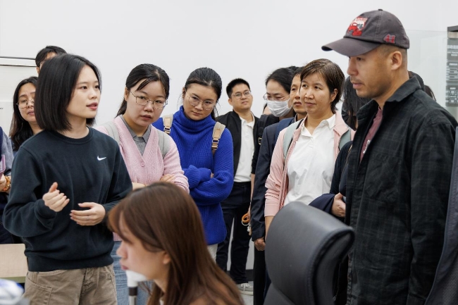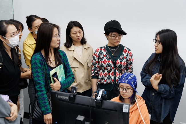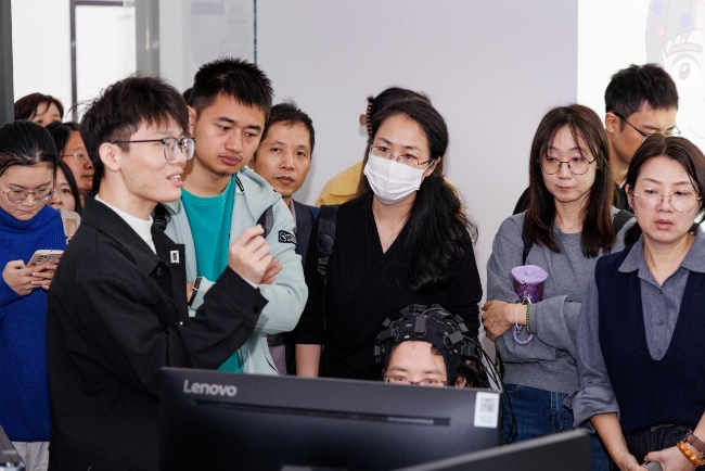 随后,教师们依次走进人工智能艺术设计创新中心、人性科技设计实验室与大型交通工具设计与制造实验室,详细了解AI艺术生成、神经美学研究、人因工程、智能交通设计等前沿方向,体验多模态虚拟现实、脑电与眼动追踪等先进设备,激发了教师们对跨学科合作与技术融合的浓厚兴趣。