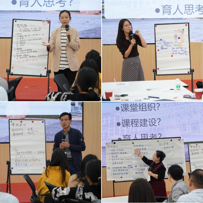 研讨结束后,每组推选一位教师代表上台汇报交流成果。代表们分别从“互动式课堂组织策略”“系统化课程建设路径”“新时代育人使命践行”三个维度,分享了小组讨论的核心观点与实践构想,展现了我校教师积极探索教学改革的热情与智慧。